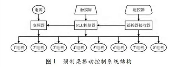 對控制柜的研究主要是研究振動控制系統(tǒng),該振動控制系統(tǒng)擬采用15kW變頻器,與PLC控制器采用 Modbus通訊協(xié)議連接,接收來自PLC的控制指令。一臺變頻器拖動8臺1.5kW的振動電機,通過接收PLC控制指令改變自身輸出頻率來改變振動電機的運行狀態(tài),同時PLC控制器輸出指令控制振動電機的運行與停止。采用觸摸屏與PLC控制器通訊,可用于修改以及顯示振動機低頻、中頻、高頻的運行時間。該控制系統(tǒng)既可以操作臺操作,也可以遙控器操作。預(yù)制混凝土梁自動振搗控制系統(tǒng)結(jié)構(gòu)如圖1所示。