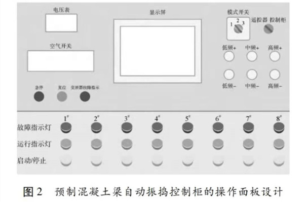 在使用附著式振動器進行振搗時,其振搗質(zhì)量主要取決于控制振動器的施工人員,若該施工人員經(jīng)驗豐富,技術(shù)較好,則振搗的混凝土質(zhì)量較好。反之,則混凝土質(zhì)量較差。因此通過自動控制來代替人為操作,可有效保證混凝土的振搗質(zhì)量。對預(yù)制梁的混凝土振搗控制柜進行改進,使其能自動控制開啟、關(guān)閉和振搗時間,并能遠程遙控,提高澆筑質(zhì)量節(jié)省人力降低生產(chǎn)成本。