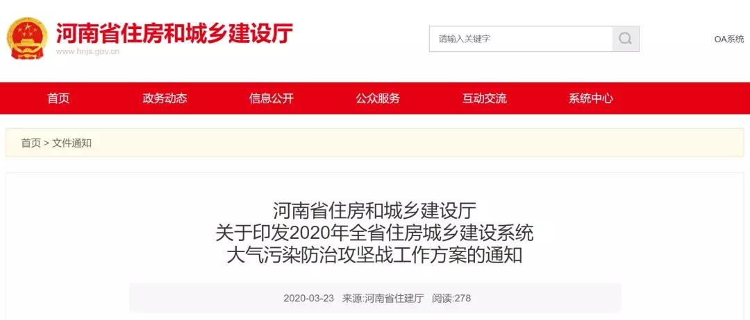 2020年3月23日,河南省住房和城鄉(xiāng)建設廳關于印發(fā)《2020年全省住房城鄉(xiāng)建設系統(tǒng)大氣污染防治攻堅戰(zhàn)工作方案》的通知,內(nèi)容強調: